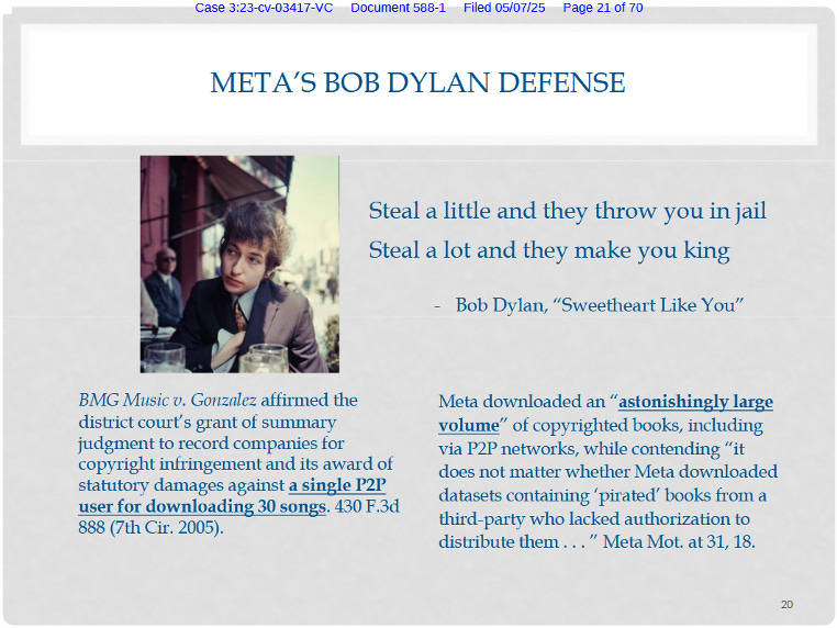Current Status: The Court held the Summary Judgment Hearing. Following the long-awaited oral arguments on summary judgment, the parties engaged in very little docket activity this week. Among the few events that did transpire, the author-plaintiffs filed their objections to Meta’s reply brief evidence. Plaintiffs are objecting to Meta’s declarations in support of its summary judgment as untimely, and asking that they be stricken from the record. Additionally, Plaintiffs’ slide decks from the summary judgment hearing were included on the docket this week. Although they don’t reveal much that wasn’t included in the briefing, one slide does accuse Meta of using the “Bob Marley defense”: